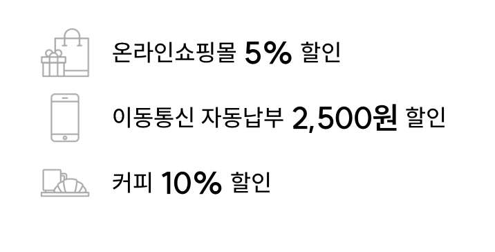 | NH농협카드 기후동행카드 | 20만원 이상 시 | 온라인 쇼핑 5% 할인 통신비 자동납부 2,500원 할인 커피 10% 할인 |