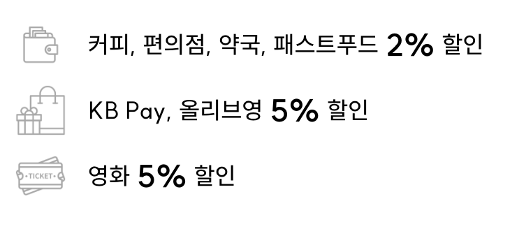 | KB국민 기후동행체크카드 | 20만원 이상 시 | 커피, 편의점, 약국, 패스트푸드 2% 할인 KB PAY, 올리브영, 영화 5% 할인 |