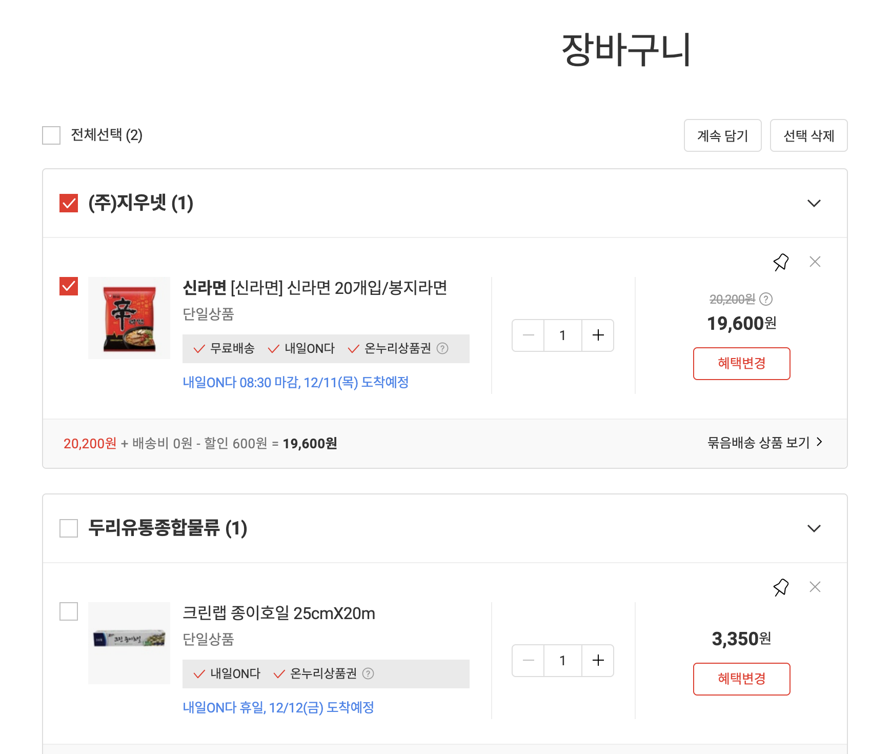 여러 상품을 장바구니에 담고 결제할 때는 한 품목씩 결제해야 온누리 상품권을 사용할 수 있다는 점이에요.